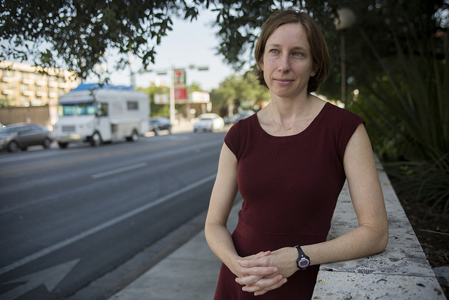 Jen Duthie stands at the intersection of intersection of W. Dean Keeton and Guadalupe. Photo by Miguel Gutierrez Jr. /KUT News.