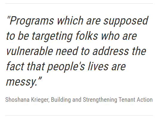 “The reality of the lives of folks who are the most vulnerable in our community is that lives are messy,” Shoshana Krieger, project director at Building and Strengthening Tenant Action (BASTA), told KUT. “That means that programs which are supposed to be targeting folks who are vulnerable need to address the fact that people’s lives are messy.”