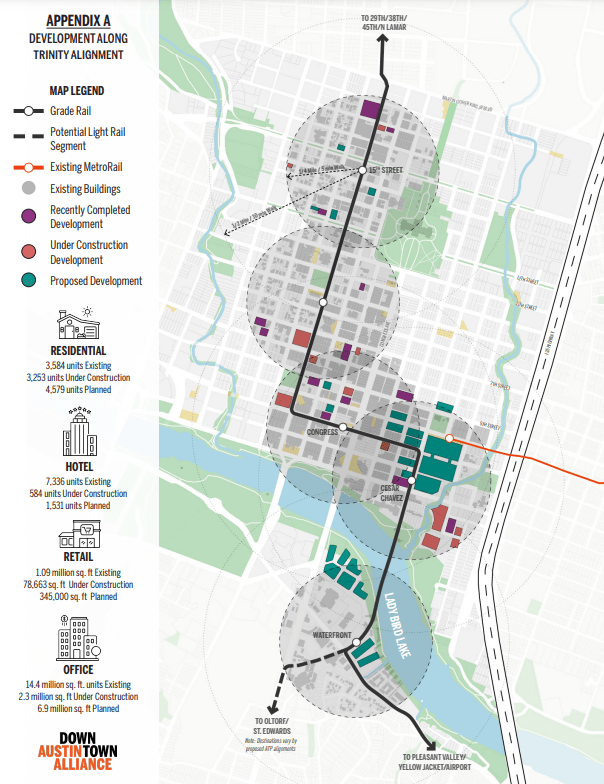 The DAA has issued its own map for the route, which runs from 38th Street south to Oltorf Street and along East Riverside Drive to Yellow Jacket Lane. The most significant suggestions are adding a station near Wooldridge Square, and sinking the street underneath the rail lines at two locations: Guadalupe and 15th streets and Trinity and Cesar Chavez streets.