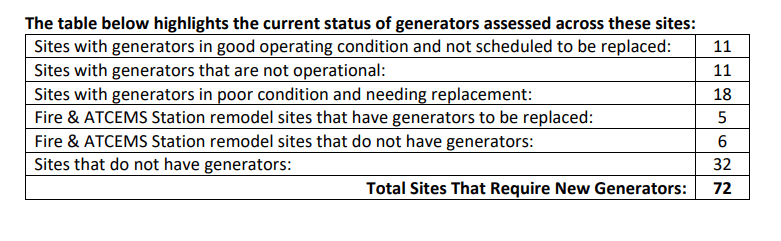 An inventory of generators and emergency backup power at fire and EMS stations has found the city is, indeed, lacking adequate resources to keep emergency services powered in the event of a blackout. Winter Storm Mara brought to light that many of the facilities were without power backup during the storm, and the recently completed survey drove that point home. The city’s Building Services Department found that 72 sites require new generators at an estimated cost of $20,521,000.