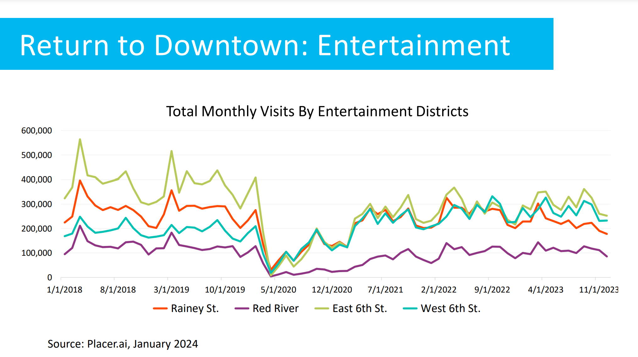 “There’s a lack of foot traffic because there’s a lack of a sense of safety,” she said. “What they’re doing is difficult because you need tenants to all come at once, and there needs to be a meaningful shift in the sense of safety. Outside of additional activations, just by virtue of getting currently vacant storefronts occupied and a perception shift around the safety of East Sixth Street, I think that will bring the foot traffic and drive demand. Sixth Street and Red River are the foundations of the brand of Austin.”
